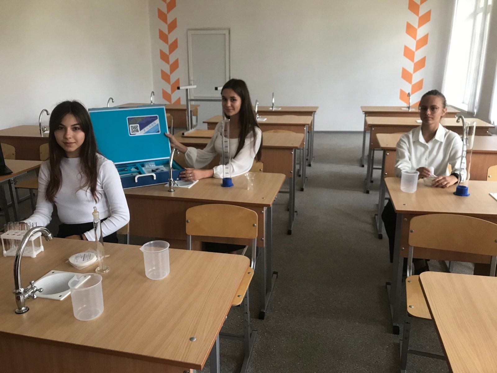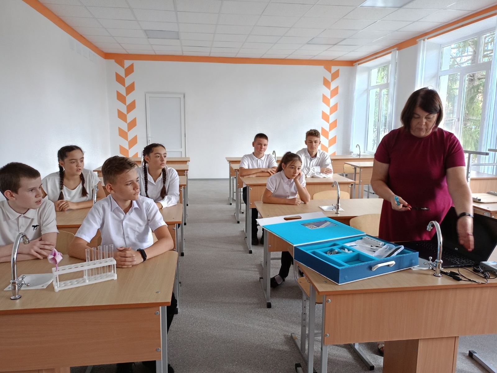 Помещения для «Точек роста» оформлены в едином стиле в соответствии с типовым дизайн-проектом, оснащены стандартным и профильным комплектами современного оборудования, расходными материалами, средствами обучения и воспитания для достижения образовательных результатов по предметным областям «Физика», «Химия», «Биология».
