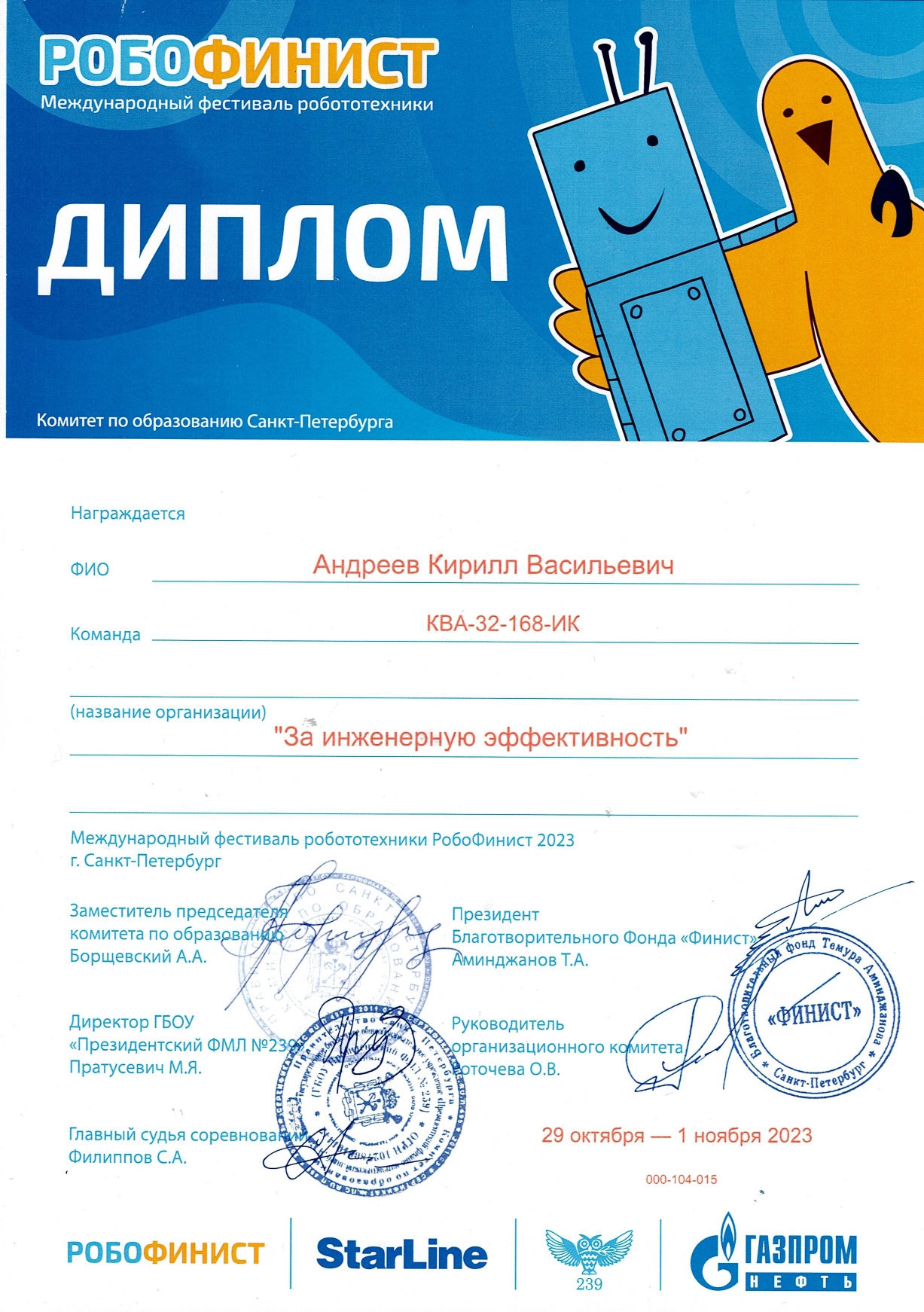 Учащийся 7 класса МБОУ «Верхореченская СОШ имени П.И. Благинина» Андреев Кирилл побывал на фестивале робототехники «РобоФинист 2023» в г. Санкт-Петербург и за инженерную эффективность стал дипломантом в номинации «Свободная творческая категория: средняя группа» (руководитель проекта – Репецкая Антонина Евгеньевна, педагог центра дополнительного образования г. Бахчисарай).
