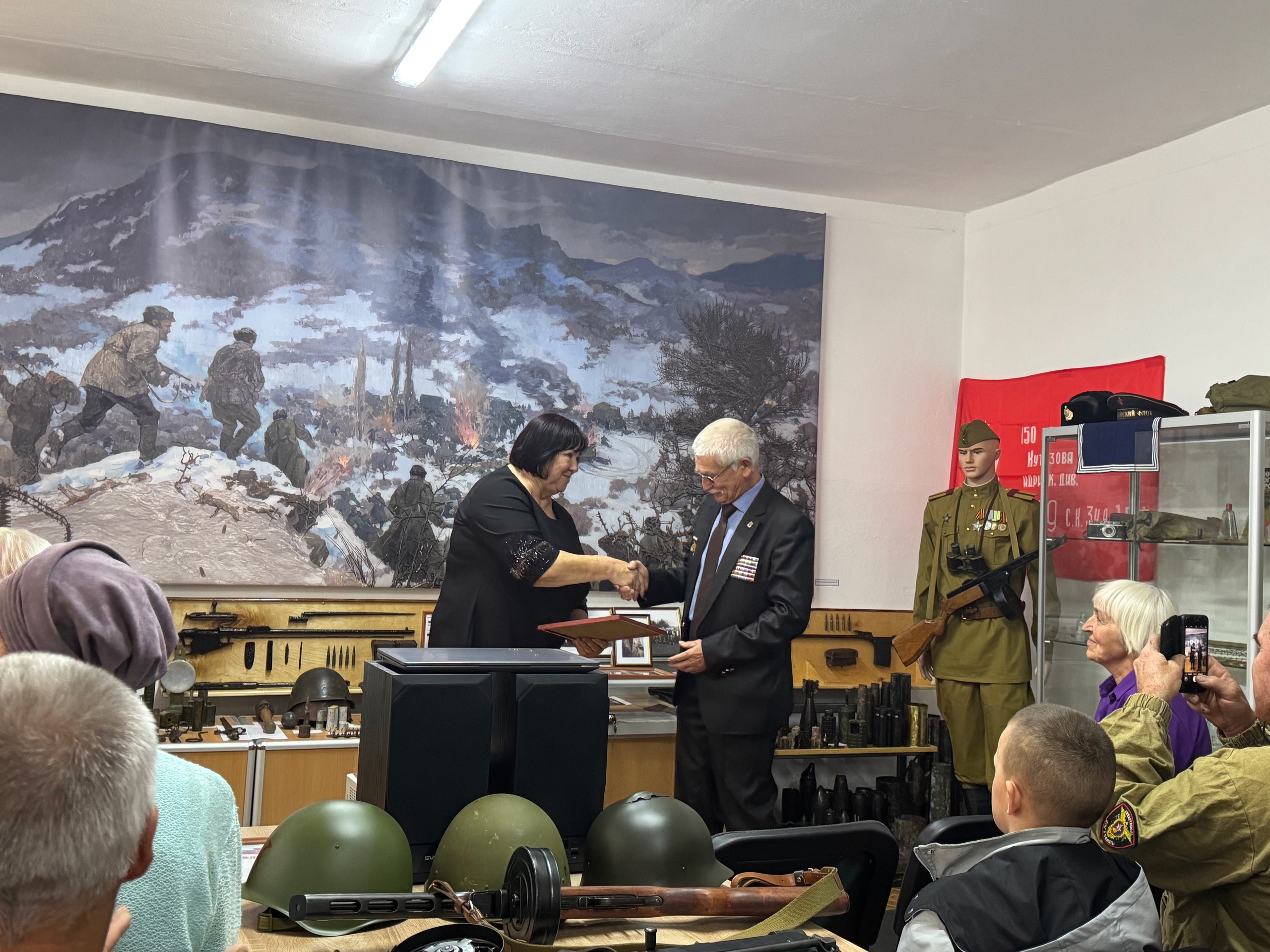 Владимир Цакер вместе с Юрием Щербинским отметили благодарностями «Боевого братства» поисковиков, местных жителей, а также руководителя нашего музея Валентину Скворцову за вклад в развитие музея. Вручили медаль «Патриот России» члену юнармейского отряда школы Ришату Менас.